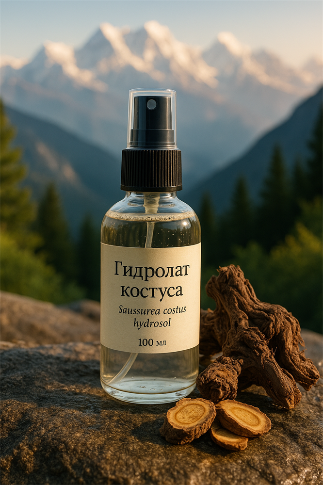 Гидролат из органически выращенного индийского костуса (Saussurea costus), культивированного в родном ареале (Уттаракханд, 2500–3500 м). Дистиллирован из ароматических корневищ; мягкая водная форма содержащая основные целебные компоненты корня костуса. Подходит как тоник для жирной и комбинированной кожи, для успокаивающих компрессов и ухода за кожей головы. Обладает регенерирующим, антисептическим, противовирусным, противогрибковым, противовоспалительным действием, способствует снижению пигментации кожи (уменьшает активность тирозиназы), улучшает рост волос.